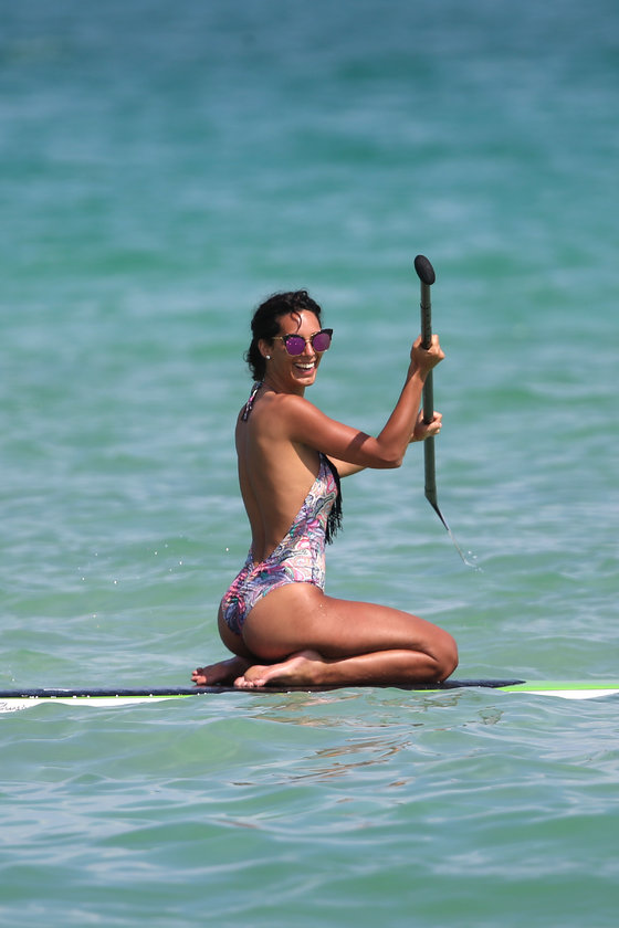 Dünyaca ünlü İtalyan güzel Raffaella Modugno, Miami'de sörf yaparken objektiflere poz verdi.